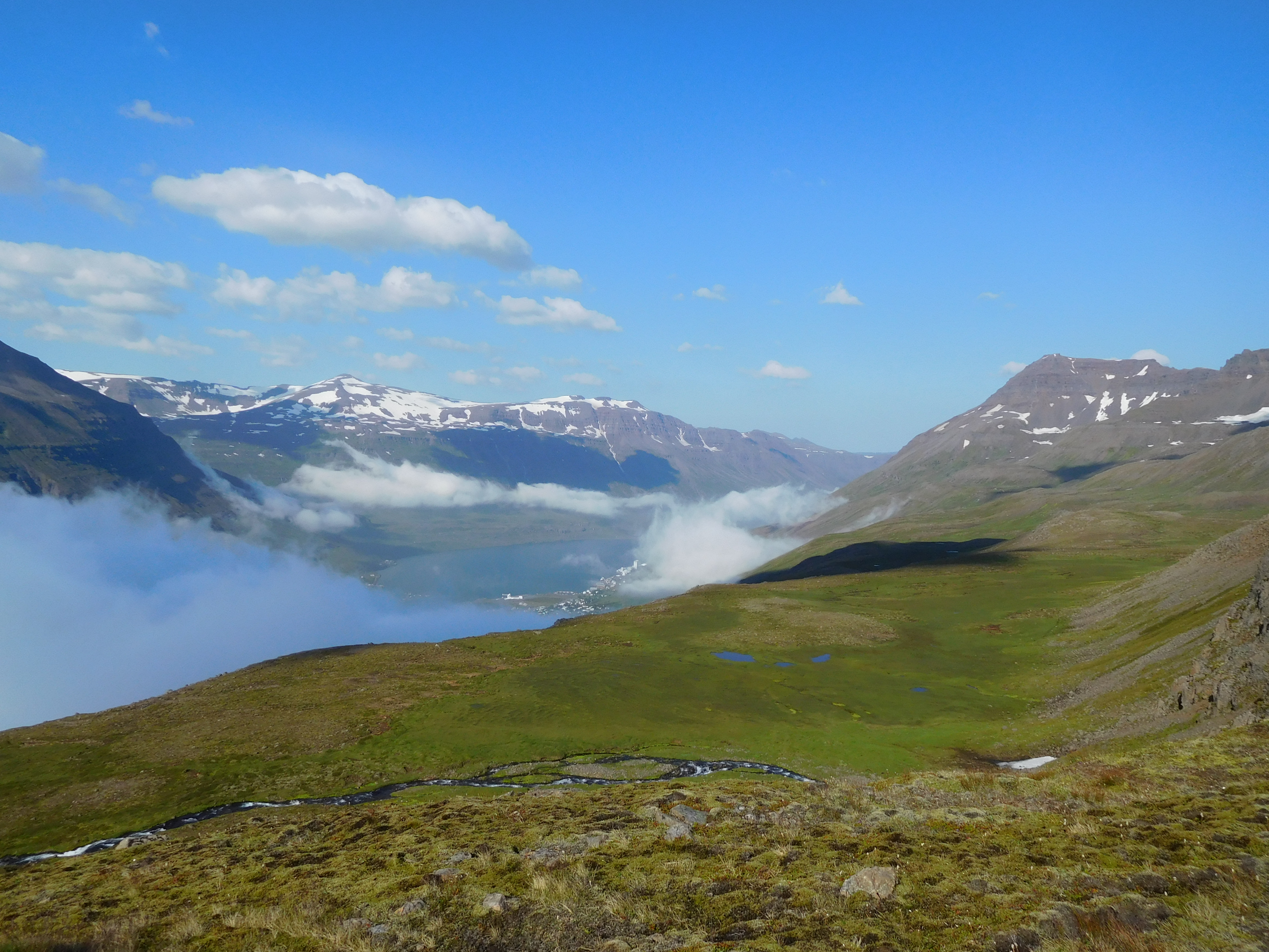 I decided I wasn’t tired enough from our cycle into Seydifjordur so I decided to go for a hike while Alli had a rest day. I talked to an old guy at the info centre about possible hikes and he was very hesitant to recommend anything given the thick fog around. I eventually found a hiking map at the camp site and decided to take something relatively simple, given the conditions. I chose one that was unmarked, but rated as relatively easy with the option of taking a more difficult route to the pass (at 1050 metres) if I got really keen.