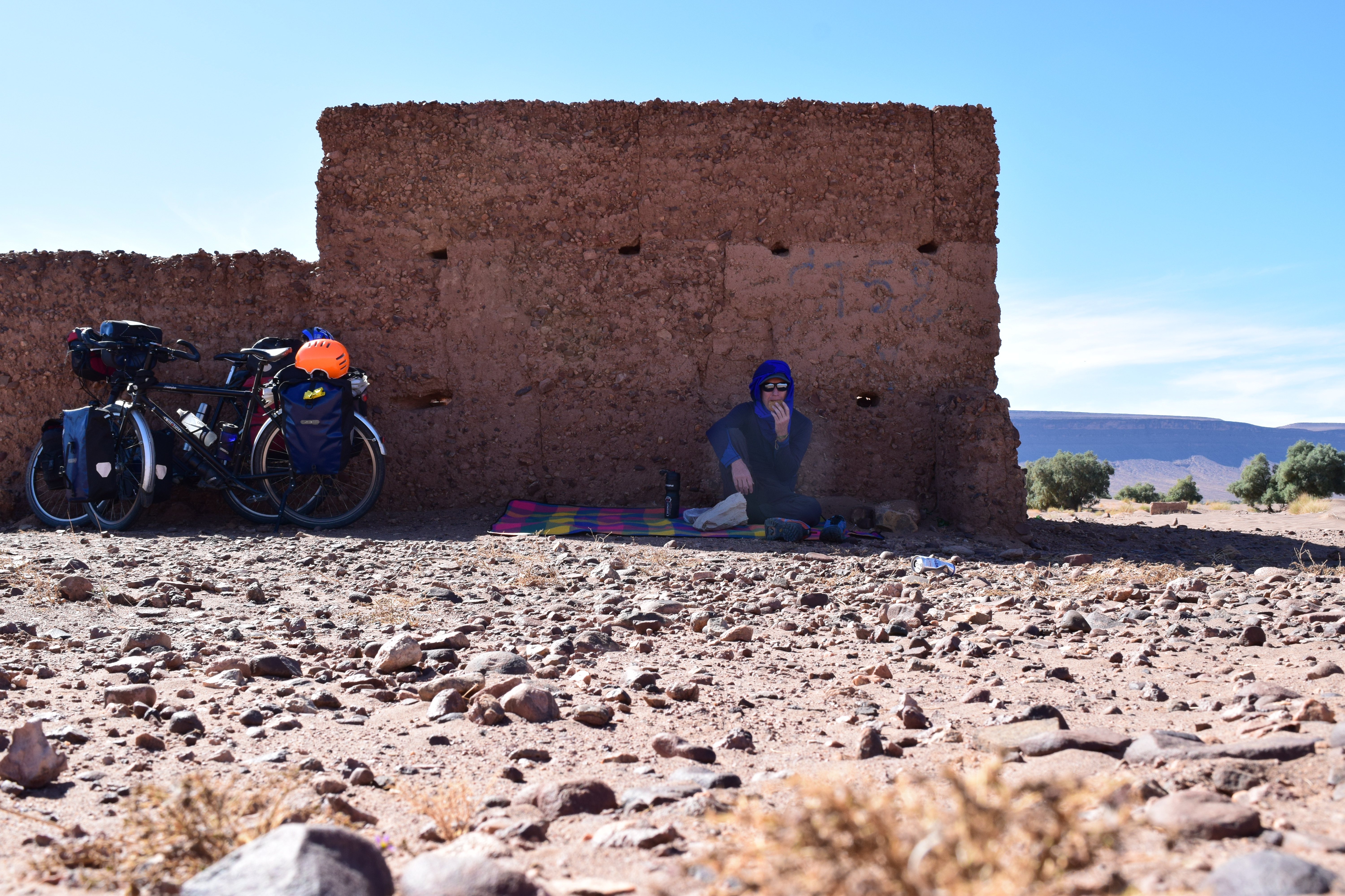 We had decided to wild camp that night, as we knew we wouldn’t be able to make the 130km to Foum Zguid in one hit. We found ourselves at the 80km mark, getting tired, and in the middle of a treeless landscape, with not a sheltered spot in sight. We saw some camels and stopped to take a picture, then rode on a couple of hundred meters and were flagged down by who we assume was the camel herder. We stoped to check everything was okay, and he came over to us and started miming a bunch of things and trying to get us to understand something. We were really confused until he said the word dirham, and then things started to make more sense. We think he wanted us to give him money because we’d taken a photo of his camel. I have a bit of an objection to someone stopping you in the middle of the road an asking for money for something like that anyway, but regardless, we’d stupidly found ourselves with no small change on us at all (the smallest note we had was the equivalent of 10 euros, which we weren’t about to hand over), so had to say no and cycle away while he was still miming and ranting. For whatever reason, the encounter left us on edge, so we cycled a bit further than we were planning in the hopes that some cover might arise and we could hide out of sight.