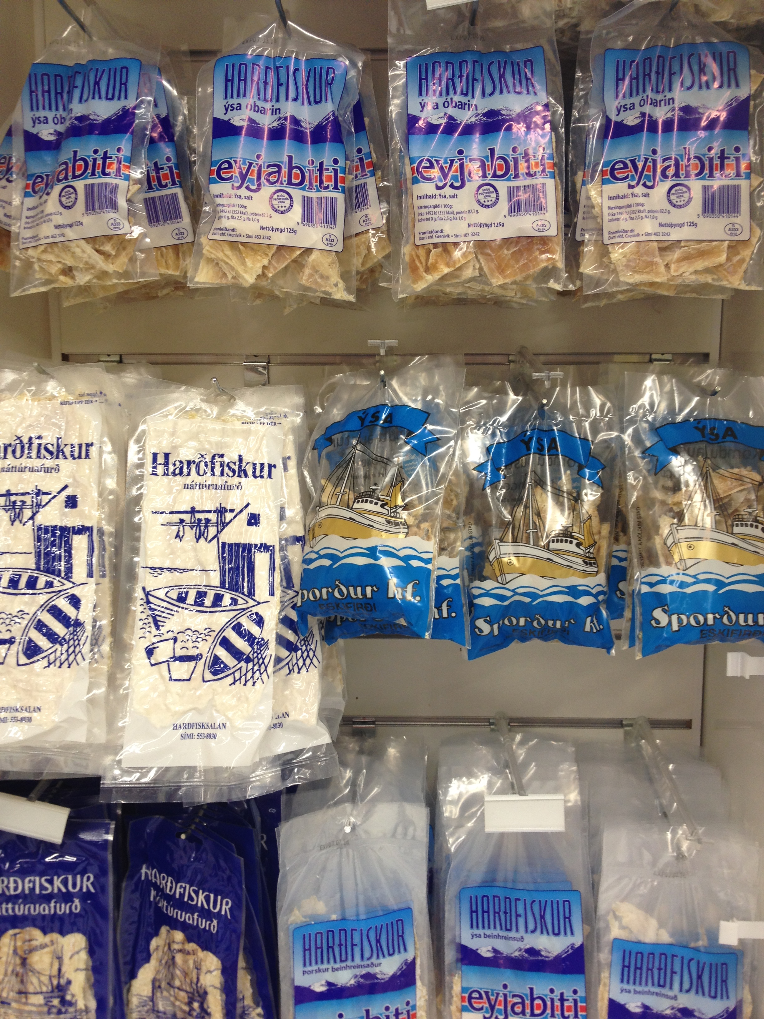 IMG_2110Being an island nation, it’s not surprising that Icelanders eat a lot of fish. You can find it in every supermarket, and in every form that you can imagine – fresh, frozen, smoked, dried, pickled, tinned… you name it, Icelanders have done it. The most interesting for us was the dried fish. It’s in every supermarket and many petrol stations, and is effectively the same as beef jerky – only fishier.
